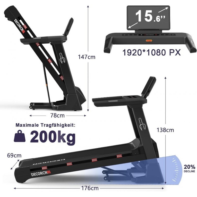 Decorcn Home Treadmill - 7.5HP, Up to 20km/h Large Treadmill, Foldable, 20 Levels Tilt, Quiet, with Interactive LCD Display and Weight Capacity 200kg